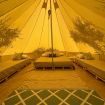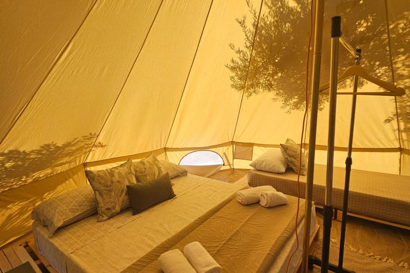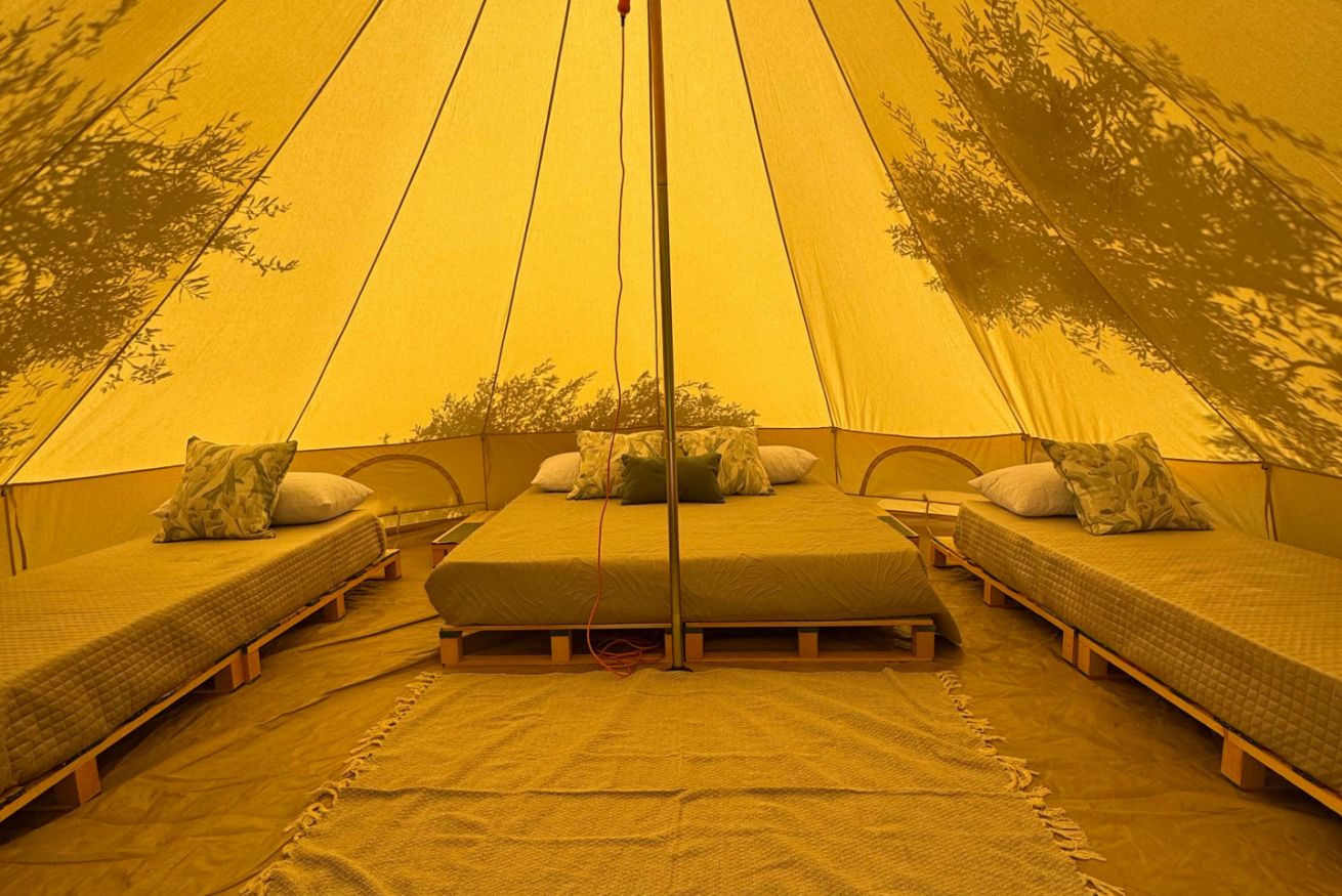La tenda glamping è spaziosa, arredata in stile essenziale e curato, ed è dotata di un letto matrimoniale e due letti singoli, perfetta per coppie, amici o piccole famiglie.